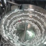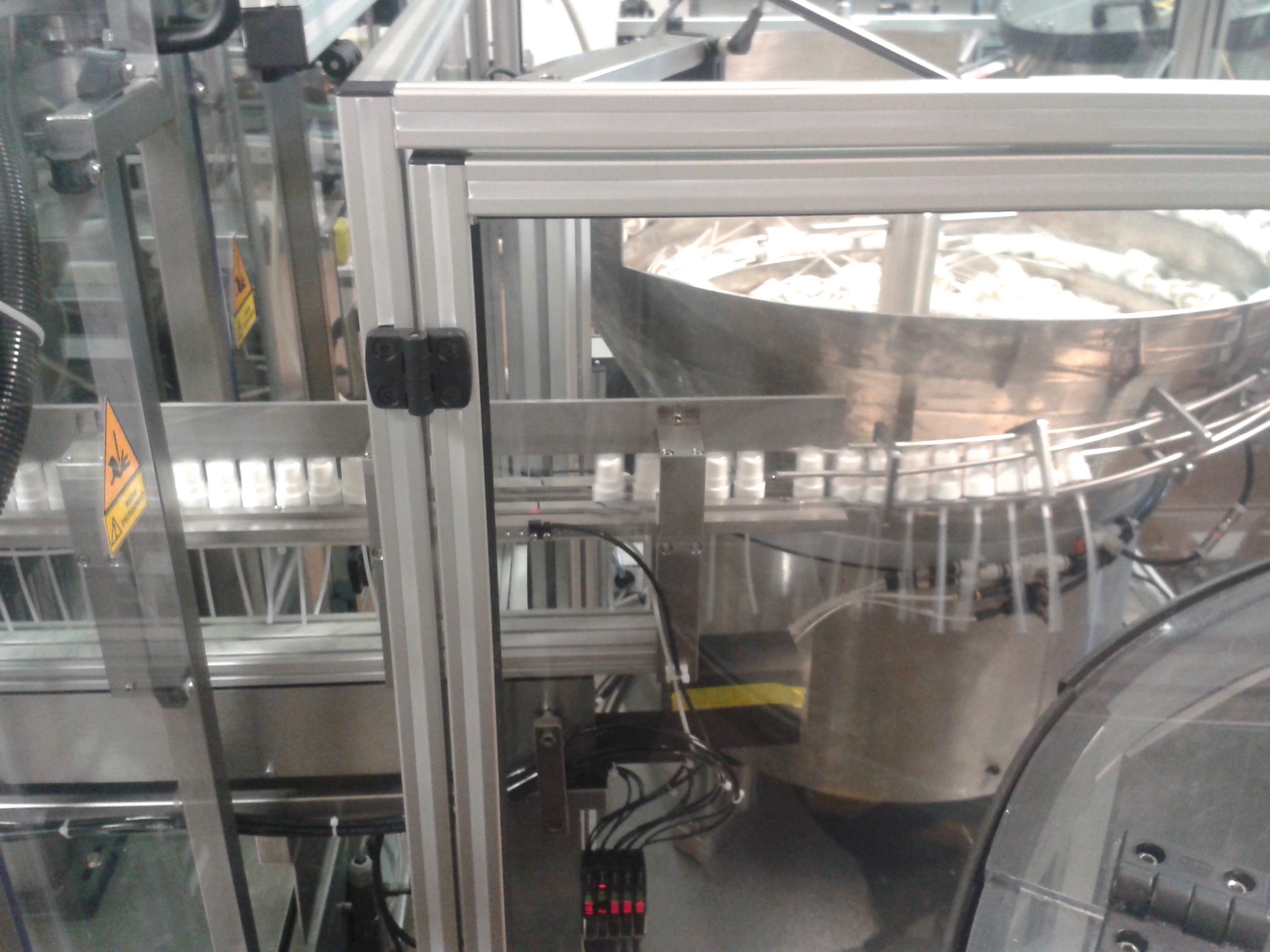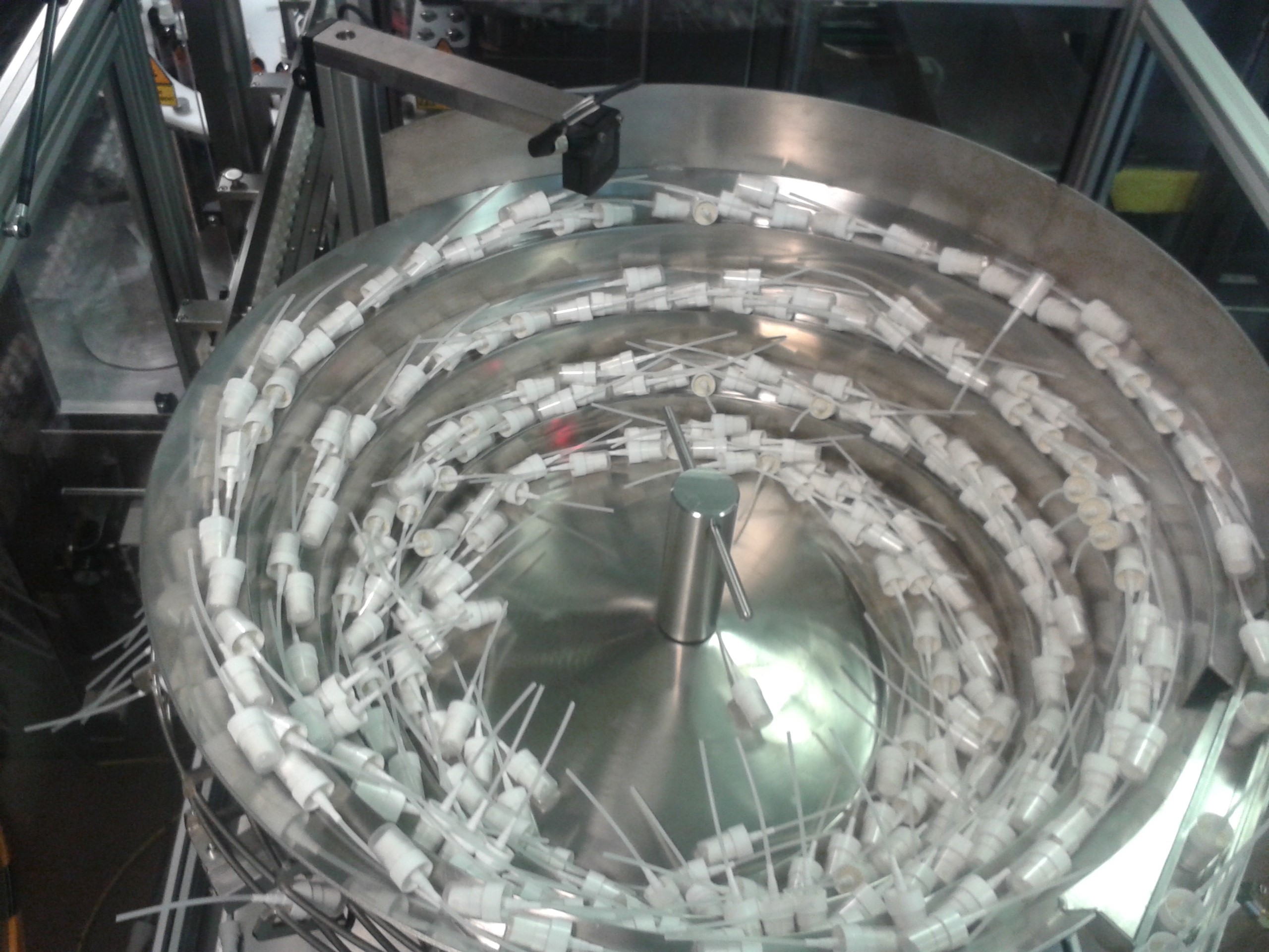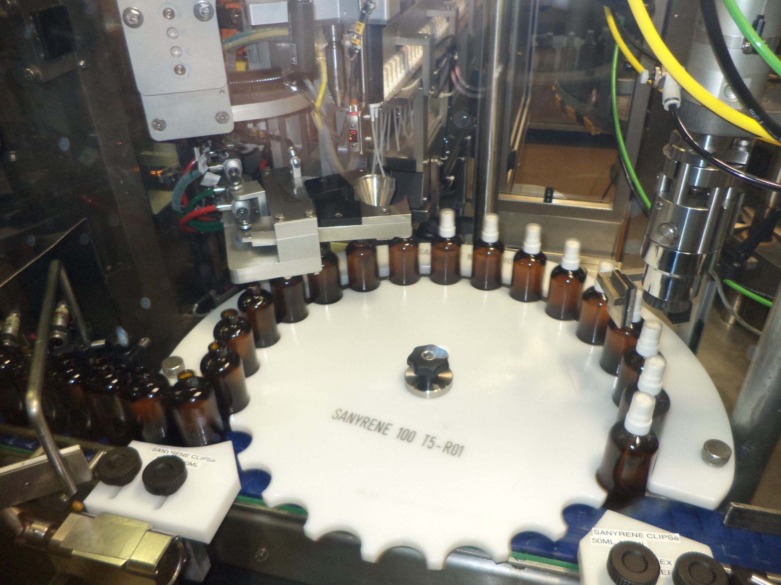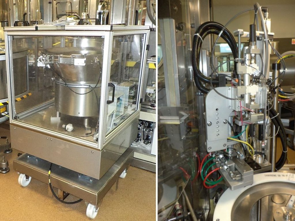 Ajout dans une machine pharmaceutique, d’un système de distribution et d’insertion de pompes sur des flacons en verre, à une cadence de 80 cp/min.