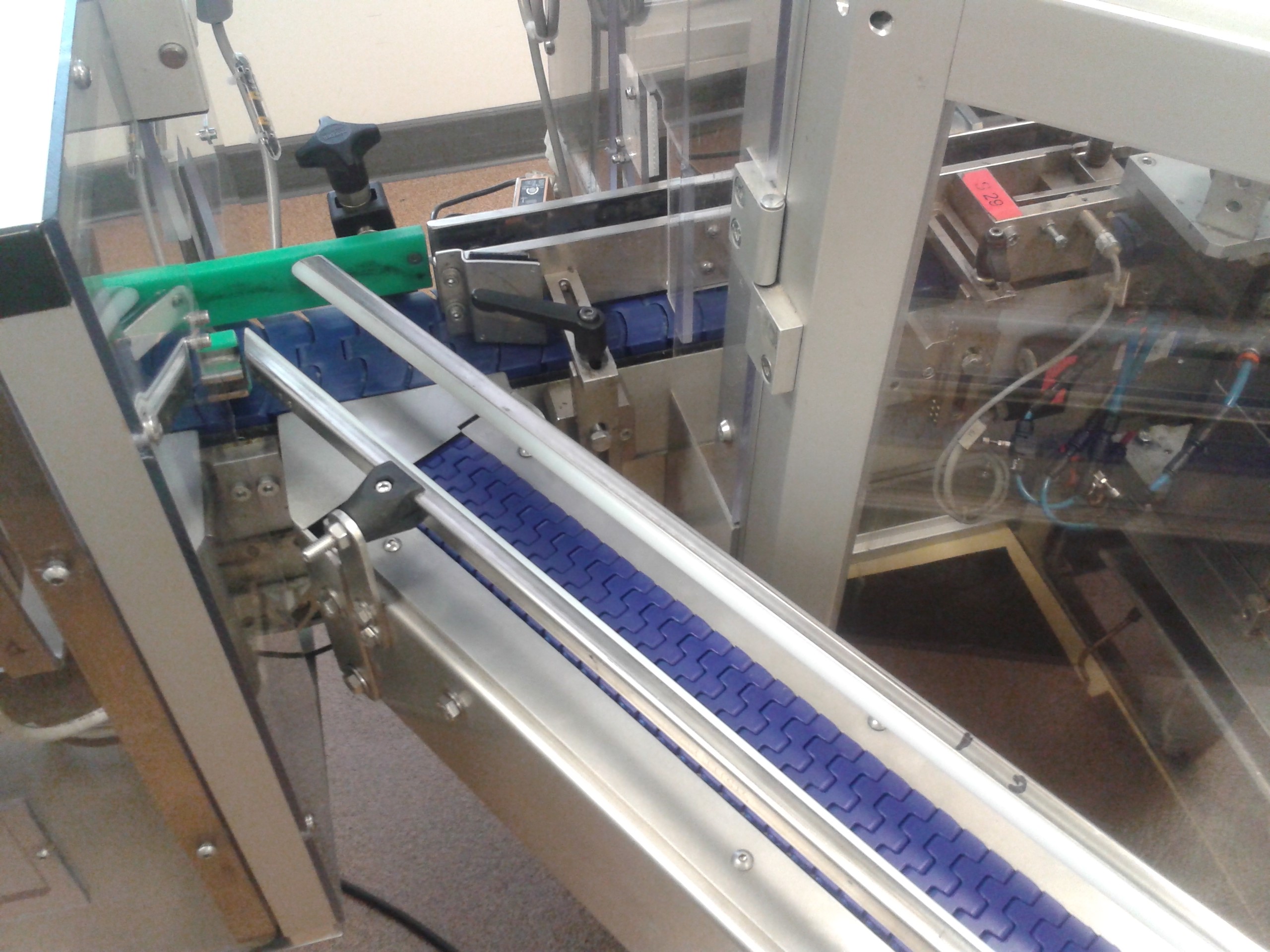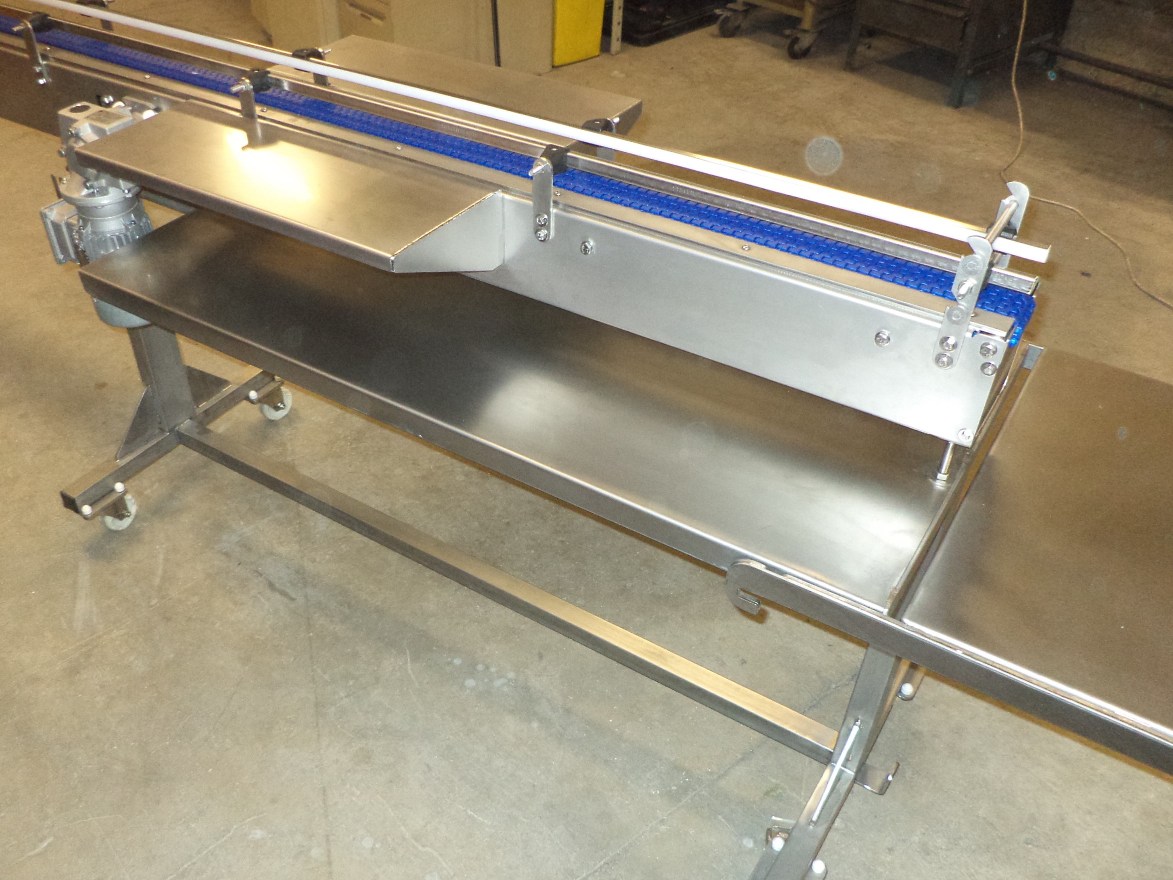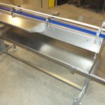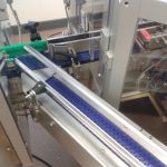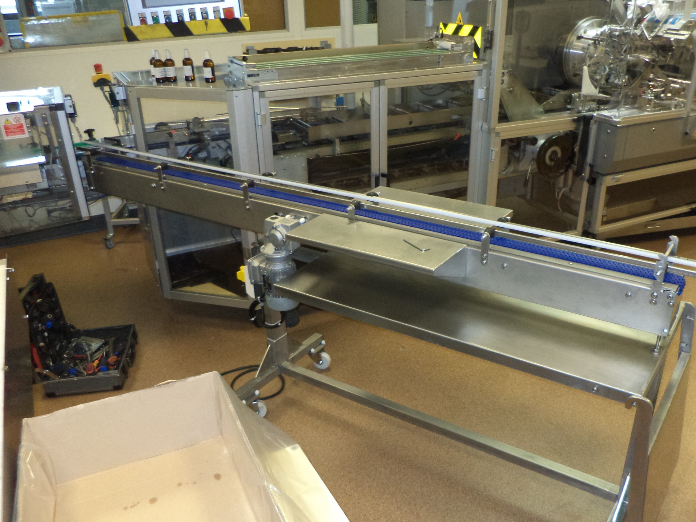 Convoyeur à tapis modulaire avec structure inox pour le pharmaceutique, avec tablettes latérales pour encaissage manuel.