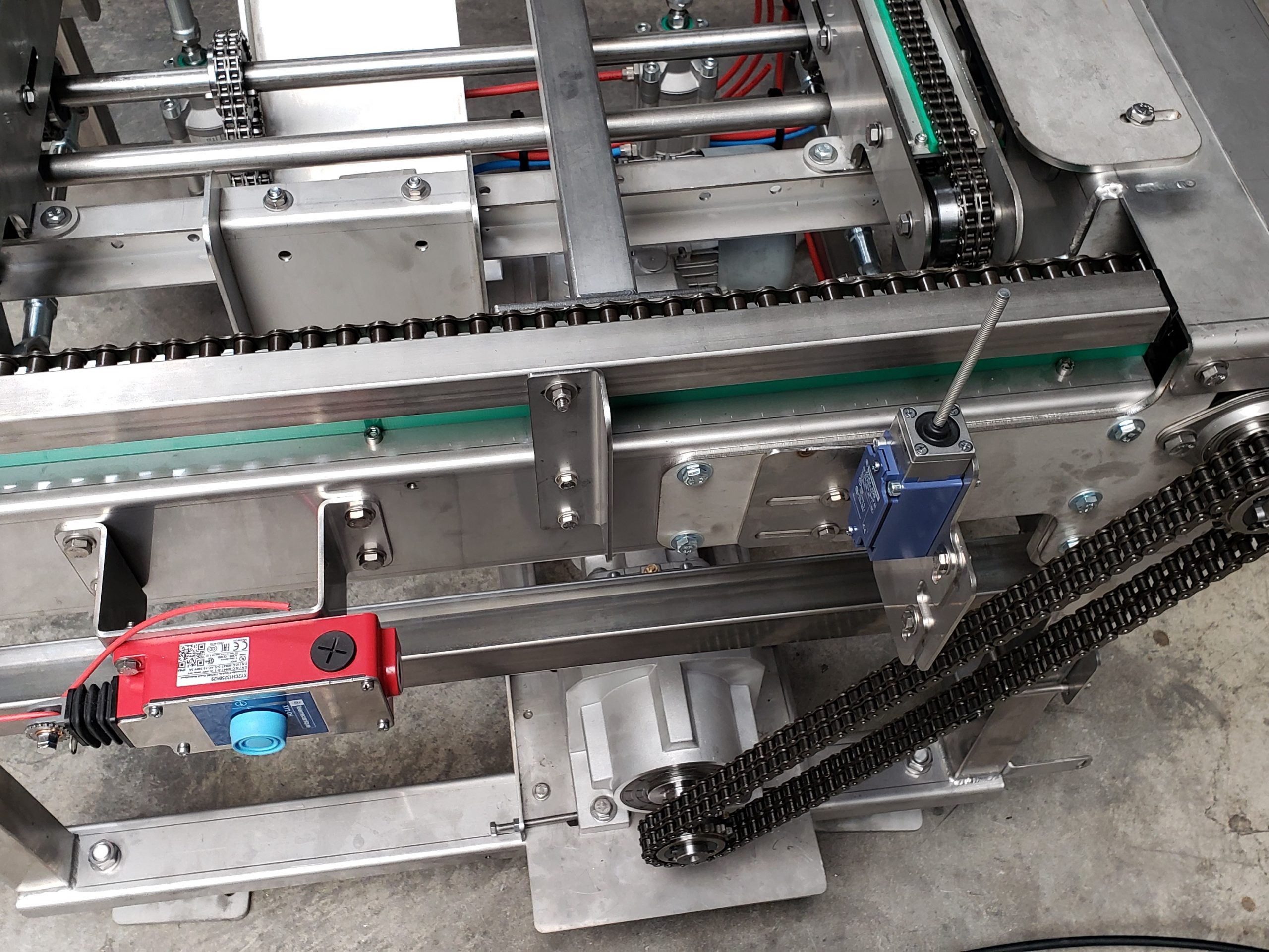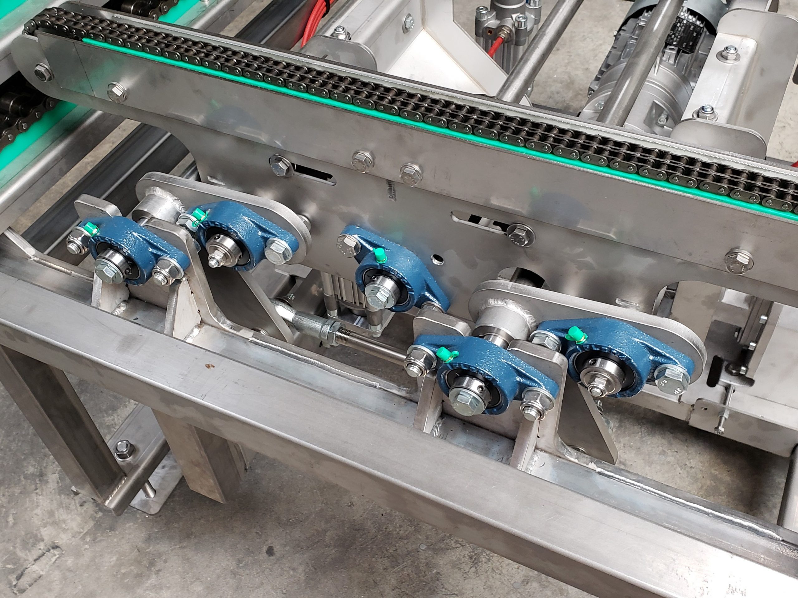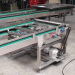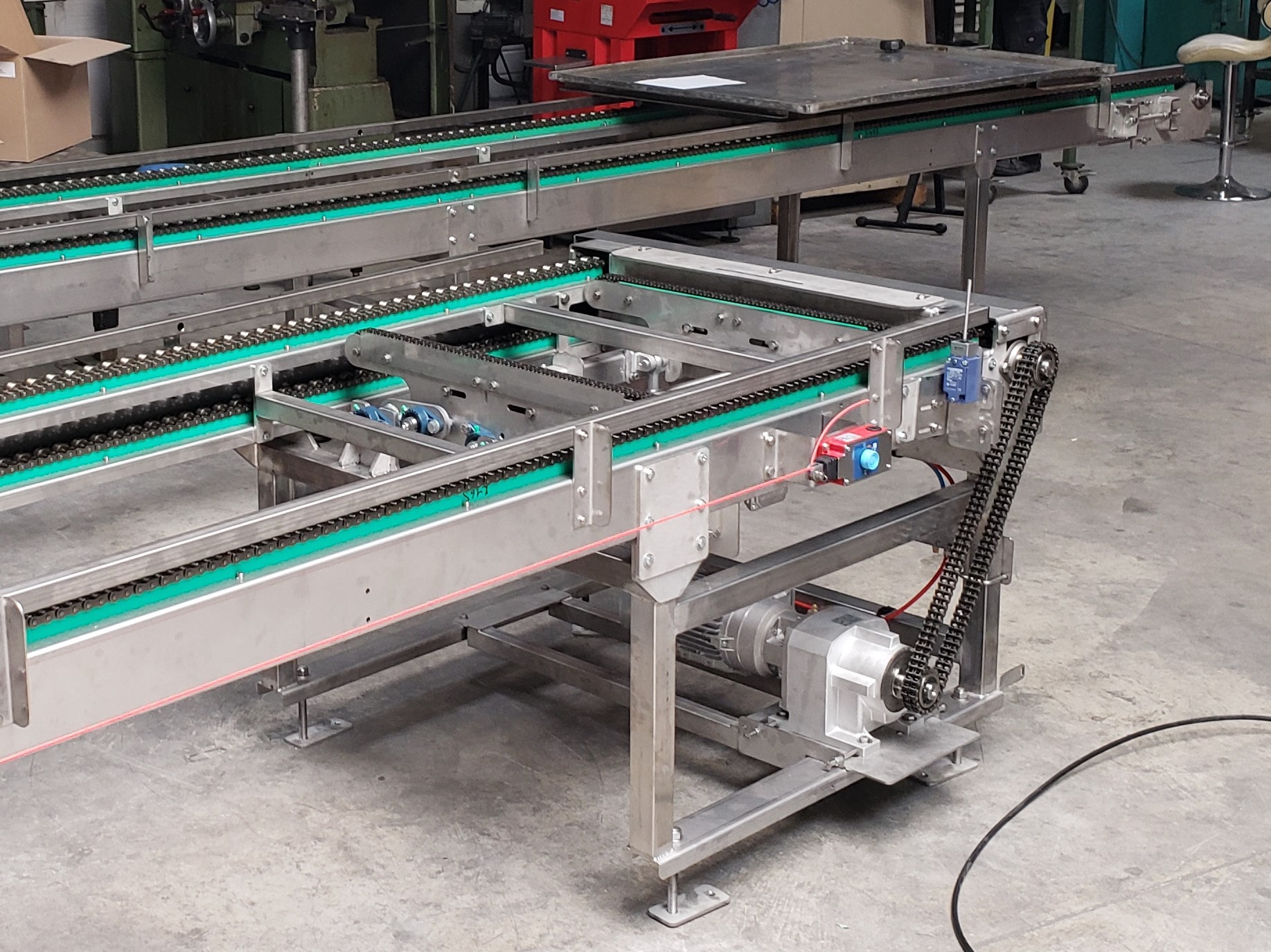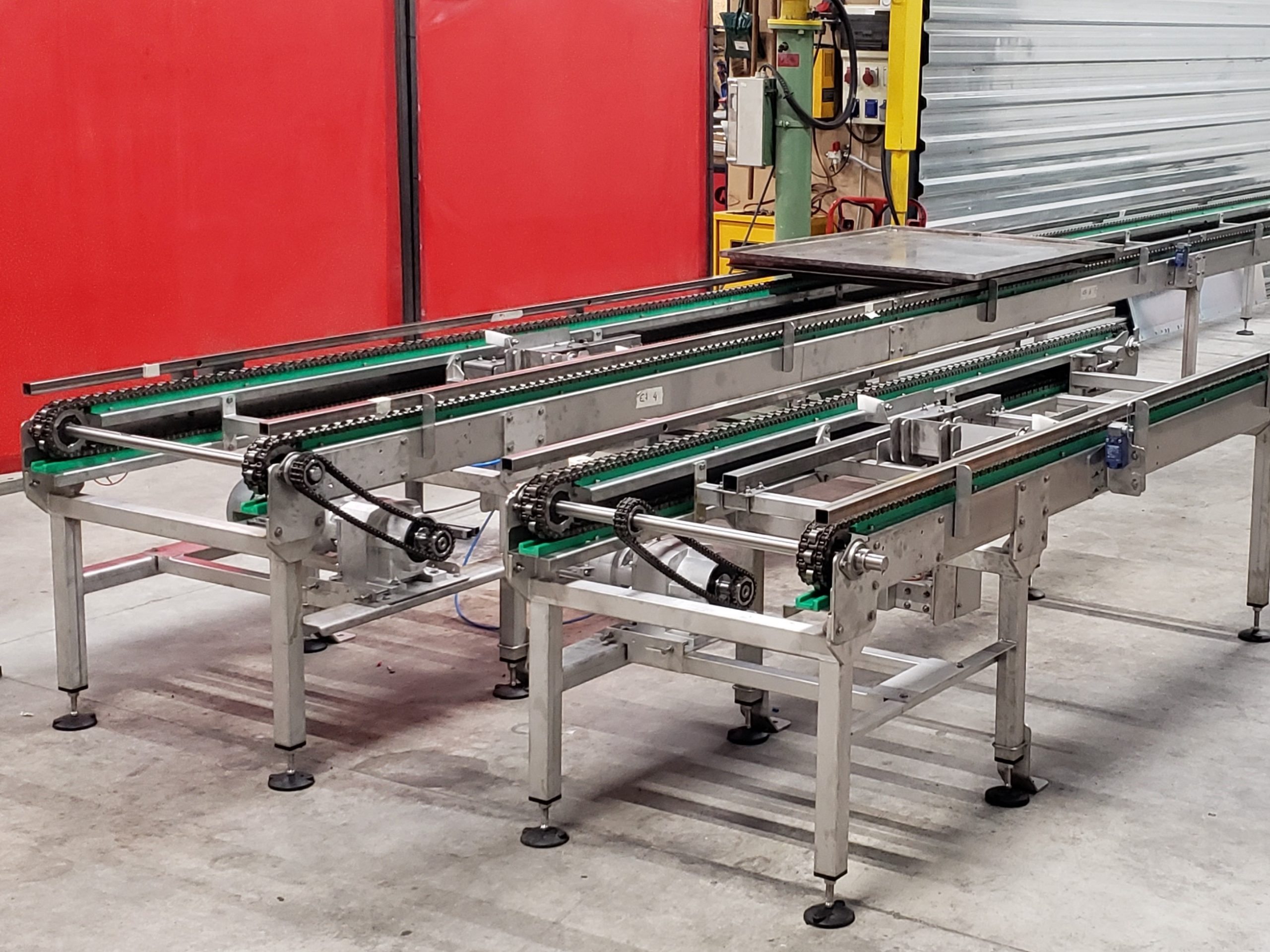 Convoyeurs à chaînes, construction tout inox, pour le transfert de plateaux lourds dans une ambiance corrosive.