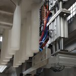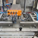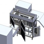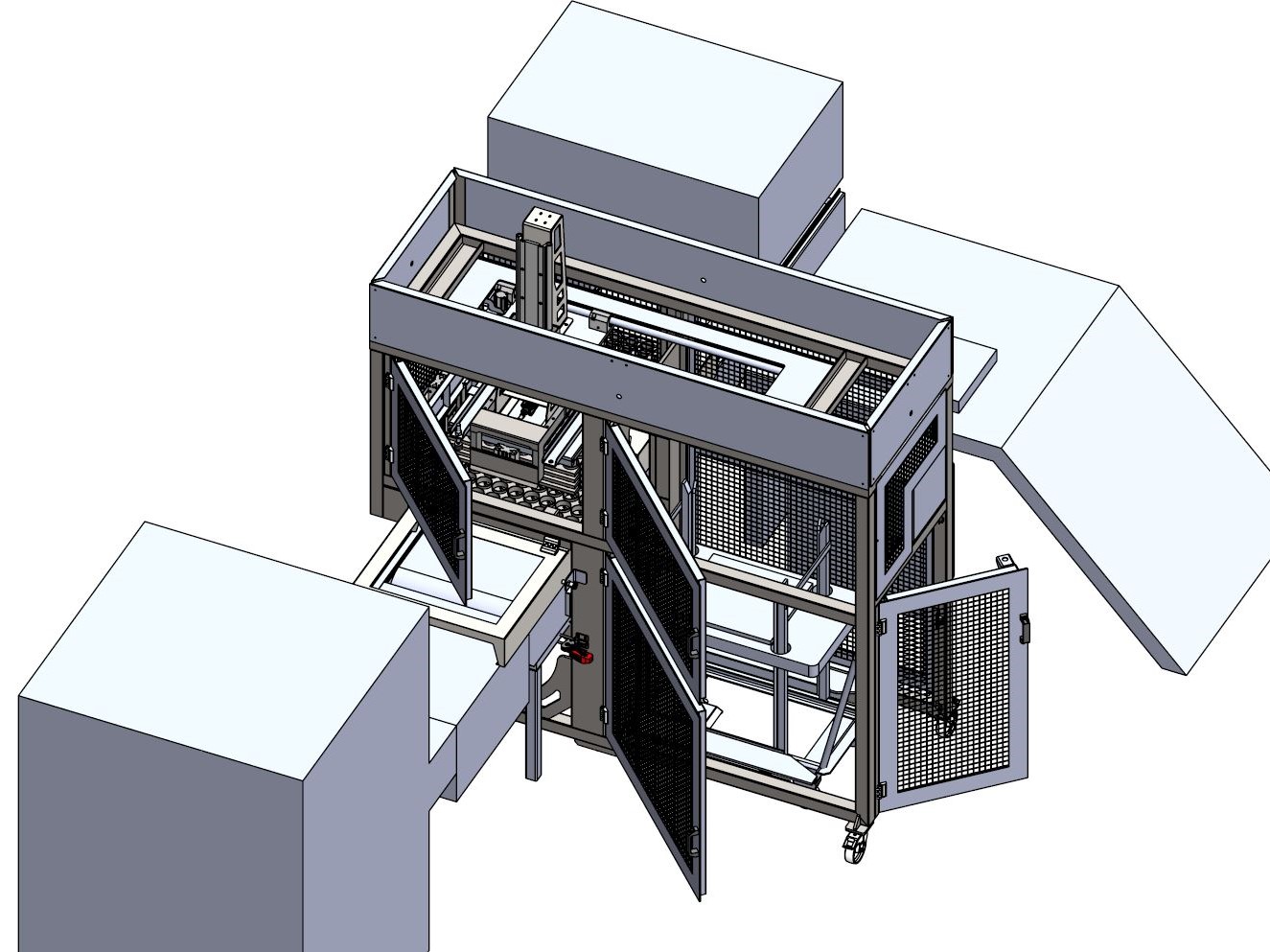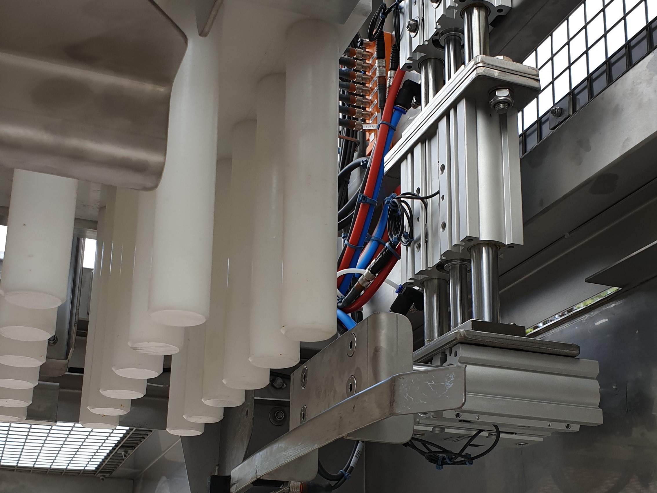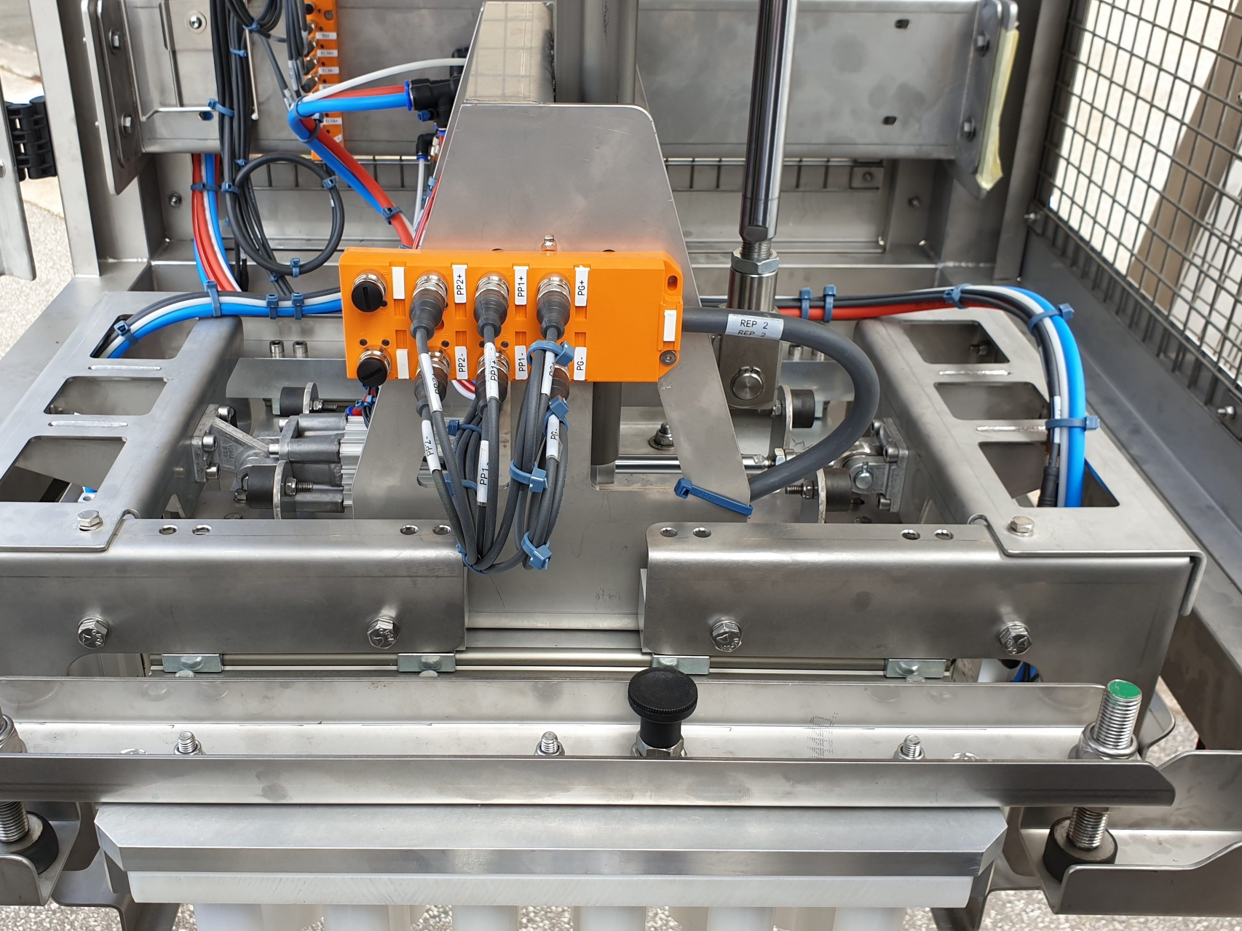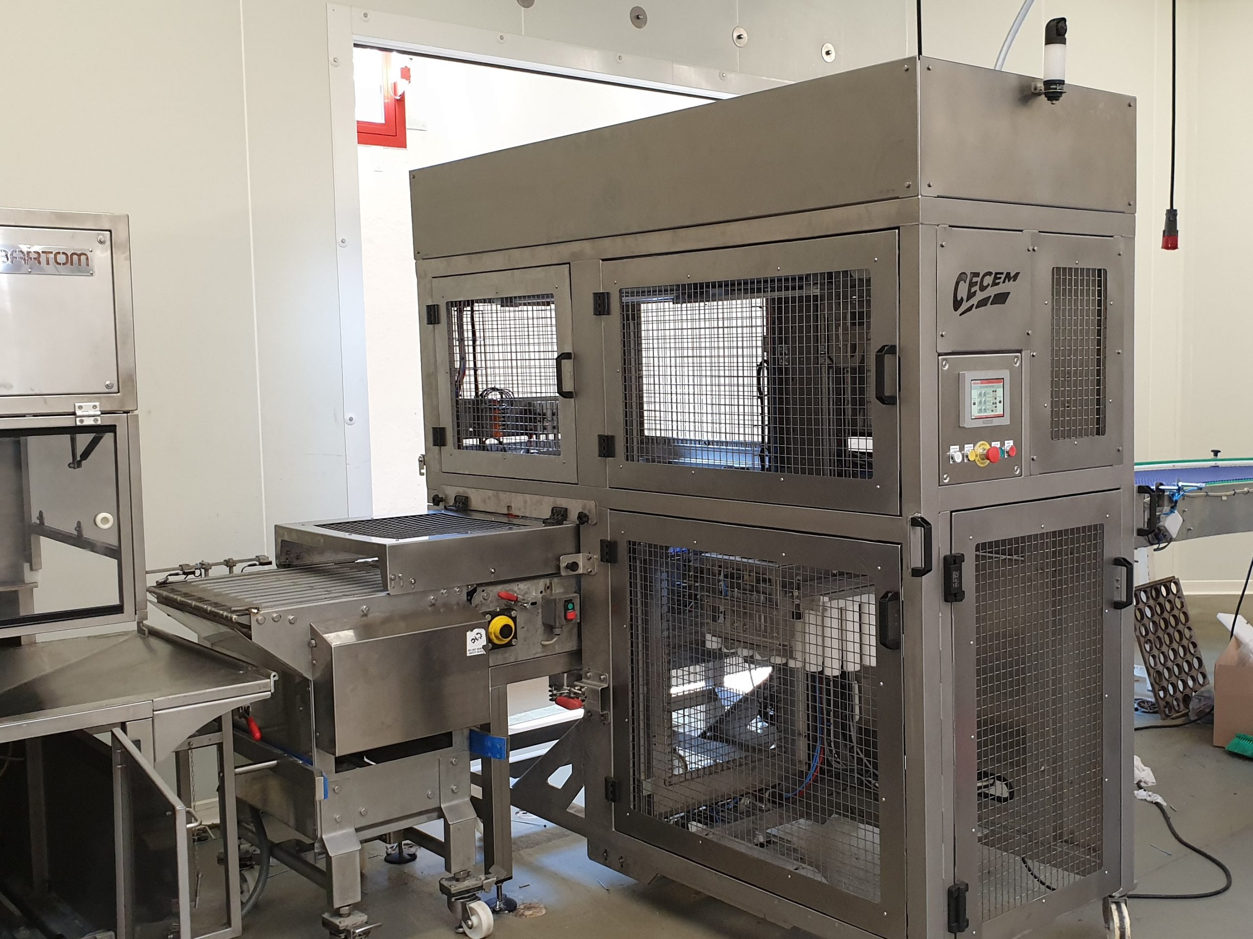 Machine automatique, toute inox, pour le démoulage de biscuits et l’évacuation des moules.