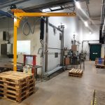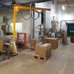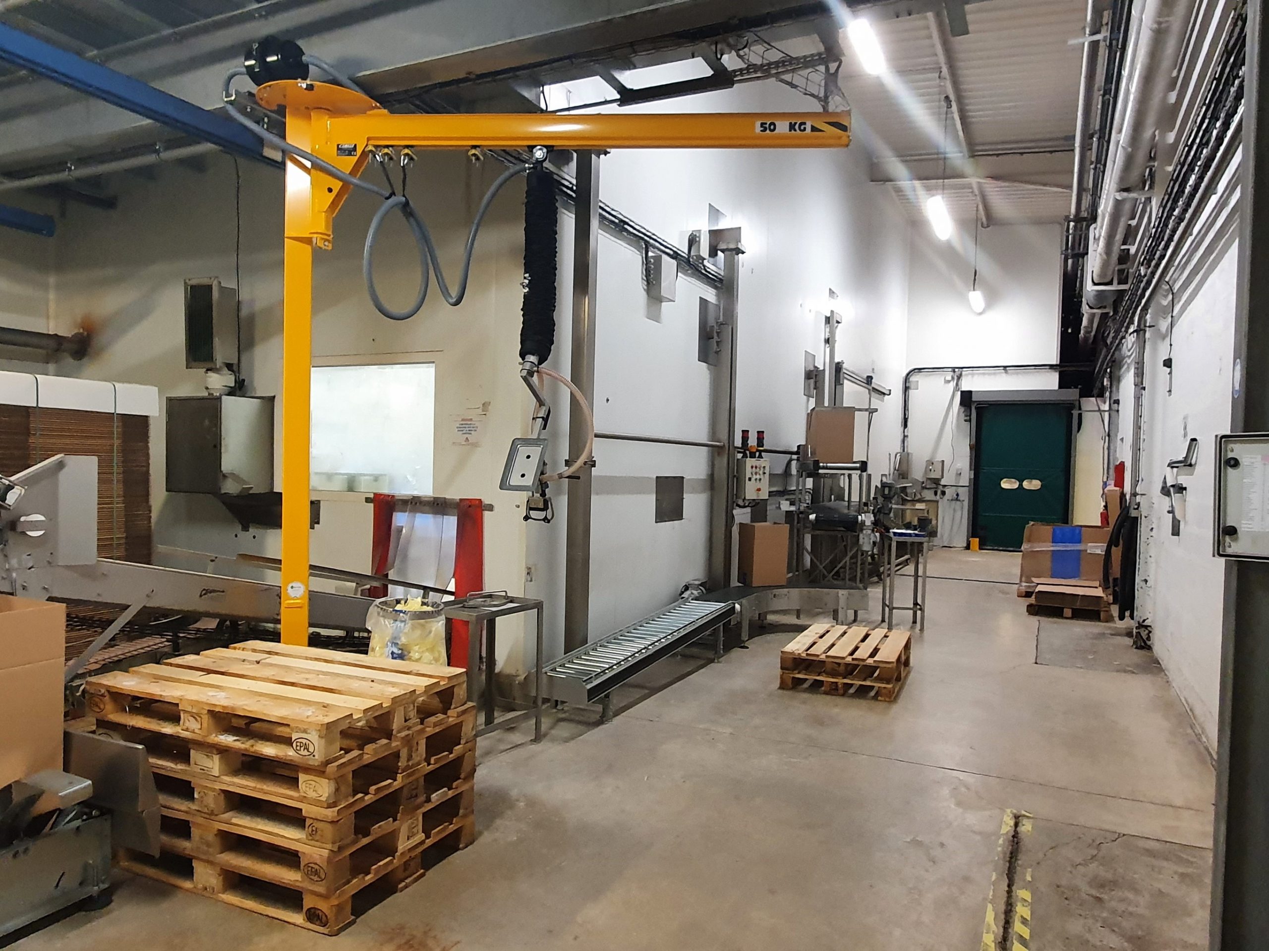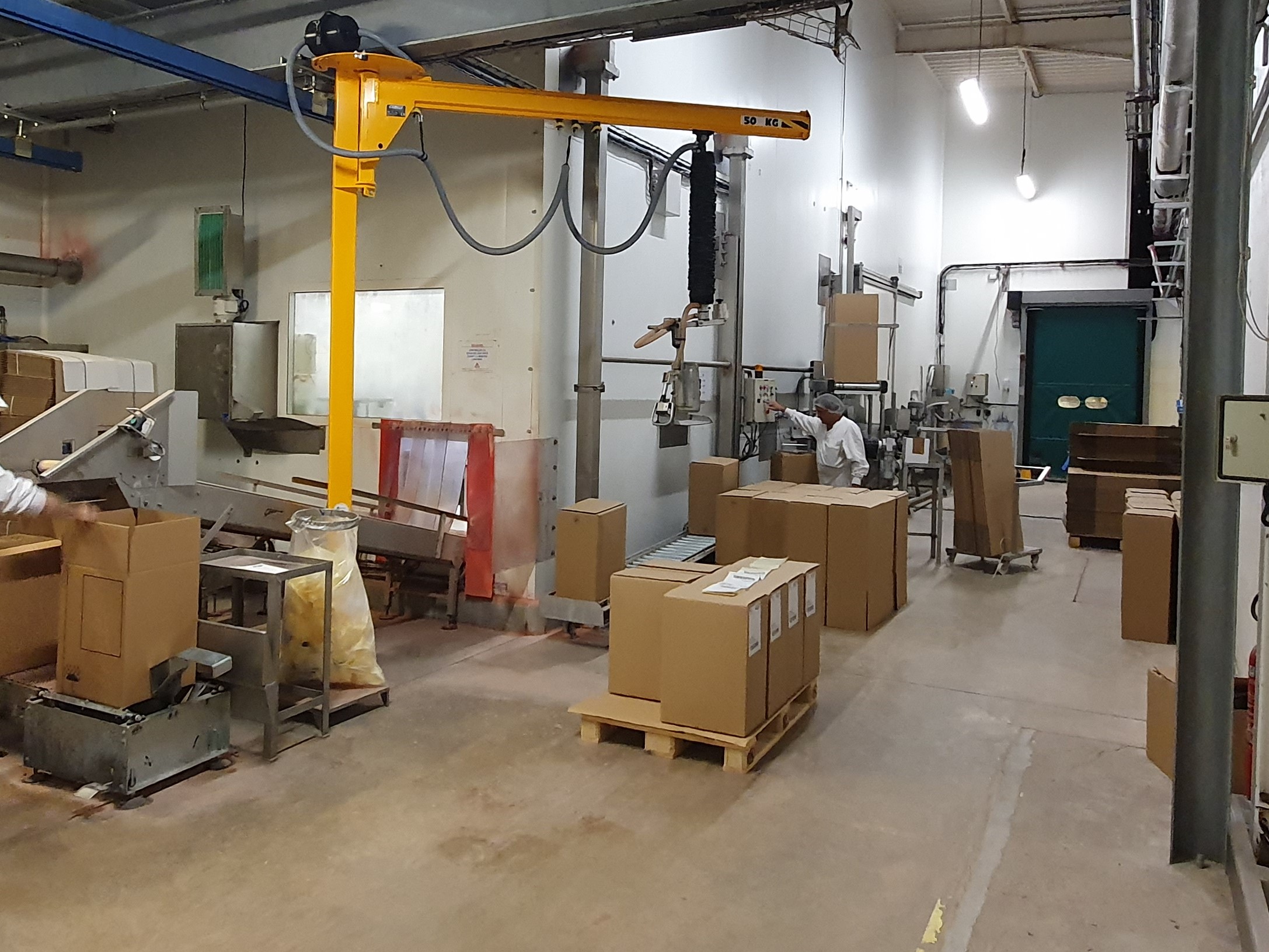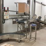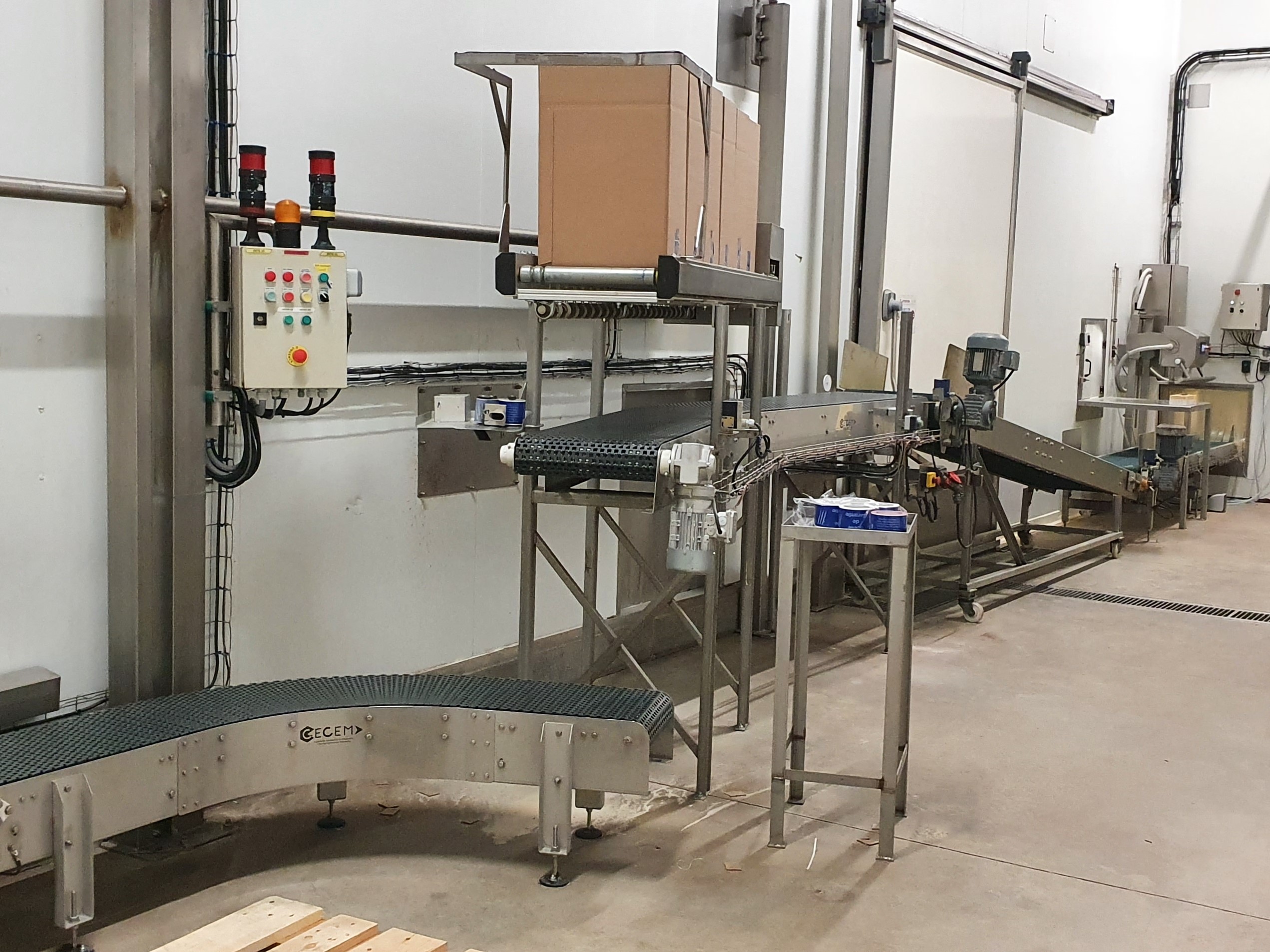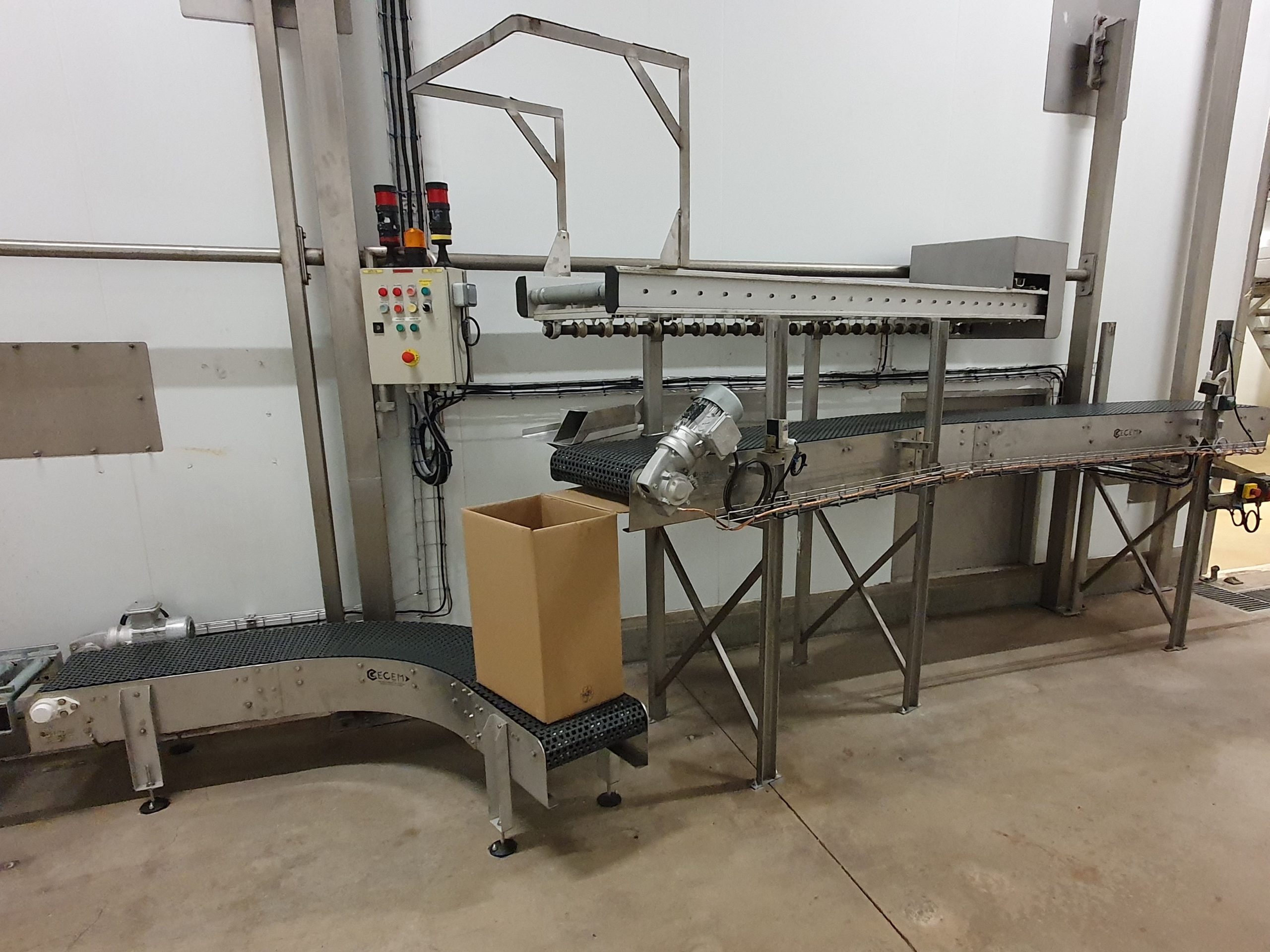 Aménagement, dans l’agro-alimentaire, d’un poste de travail avec des convoyeurs à tapis modulaire courbe et structure inox, pour la mise en cartons de sacs de produits de 25 kg.