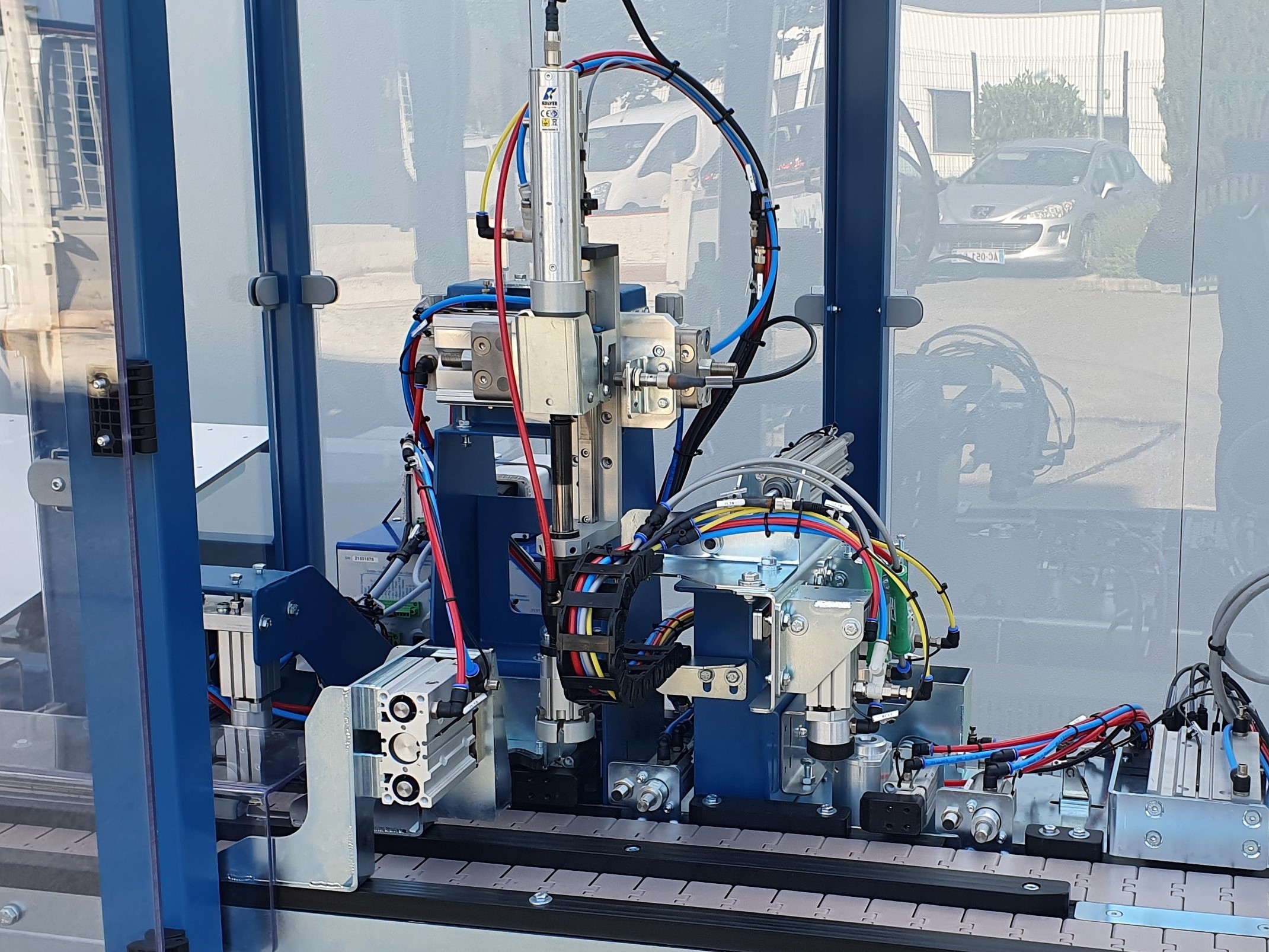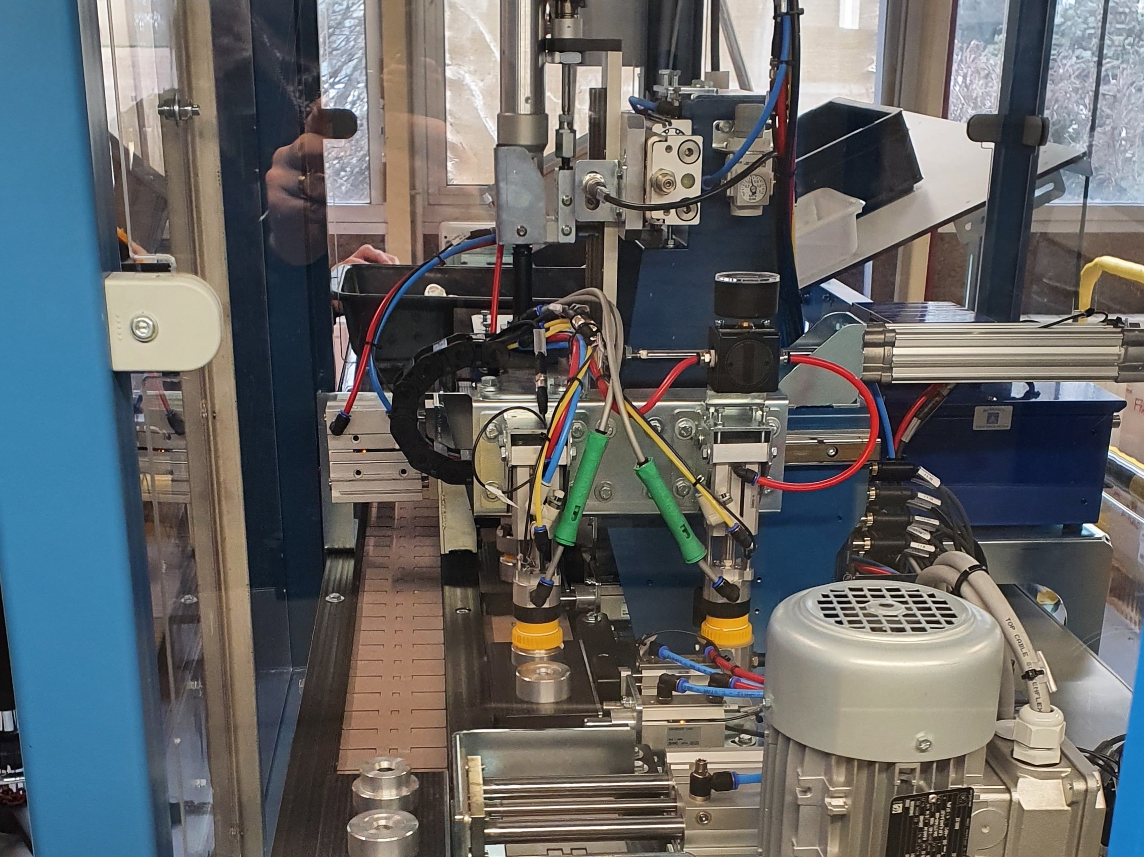 Poste à chargement manuel permettant le pré-assemblage et le vissage des 4 composants formants un bouchon. Contrôle de l’étanchéité sur 100% des produits, et éjection des non-conformités.