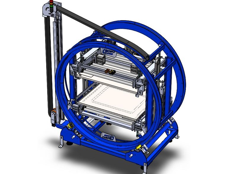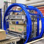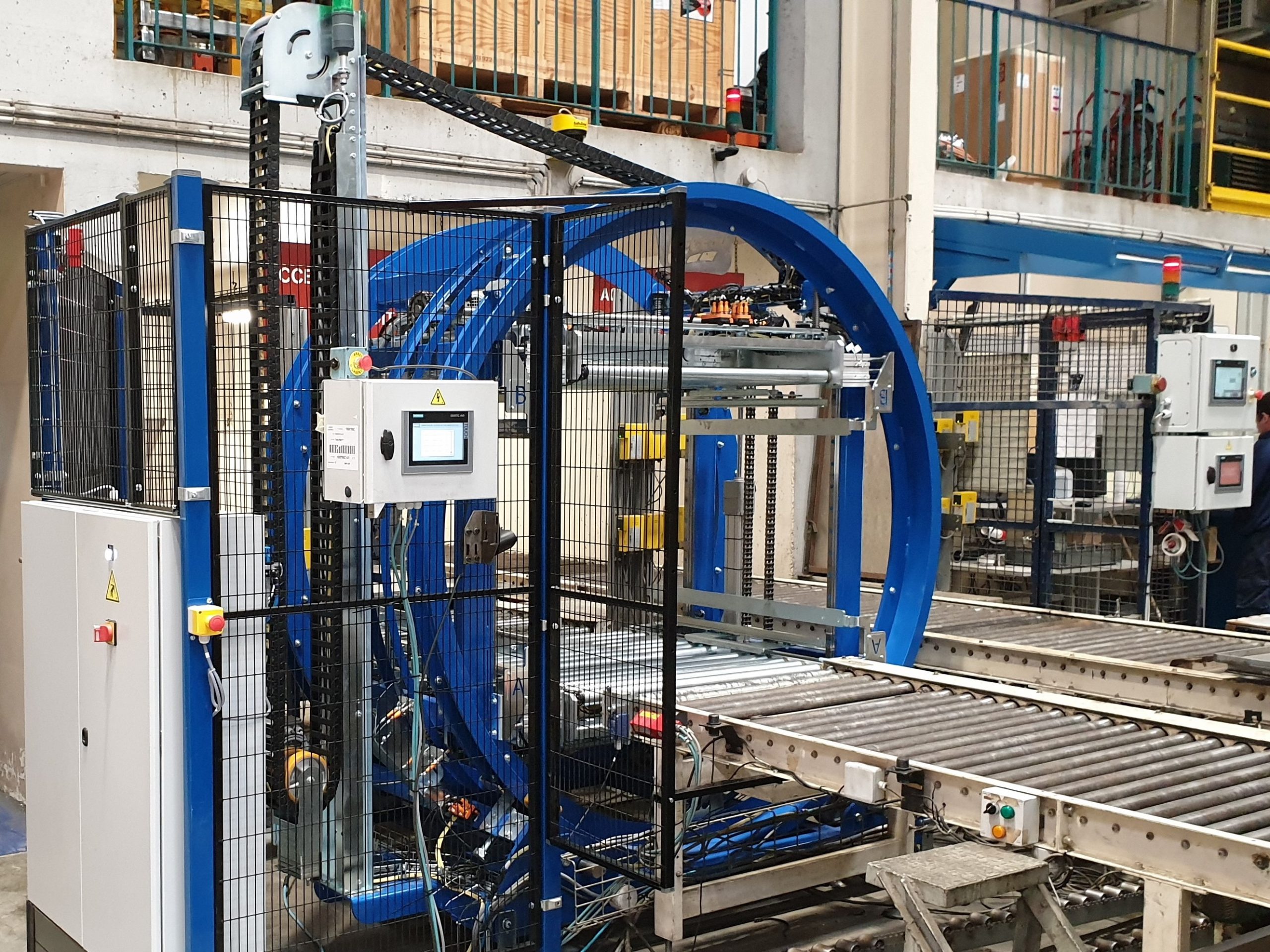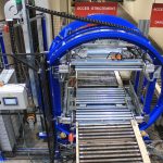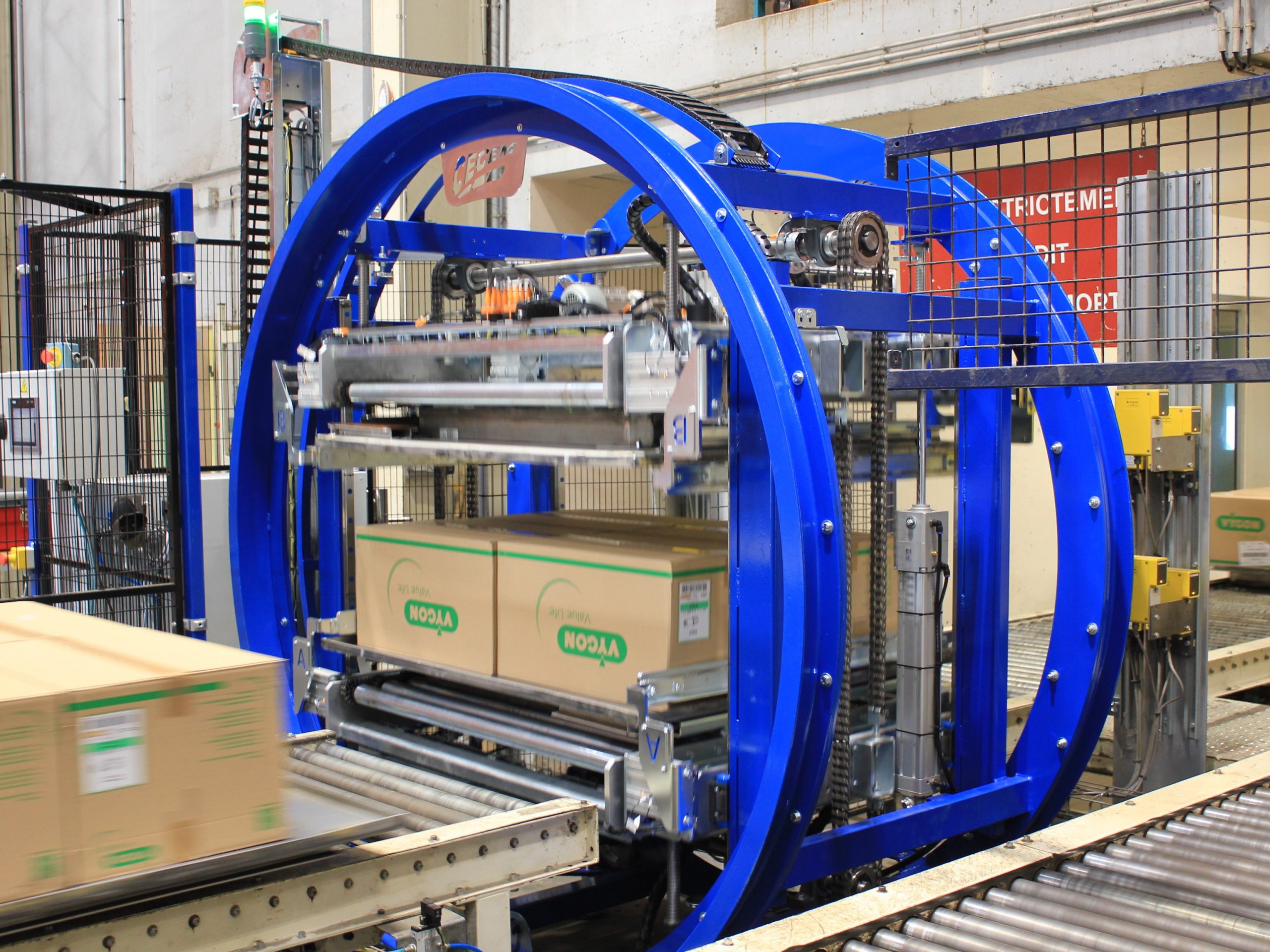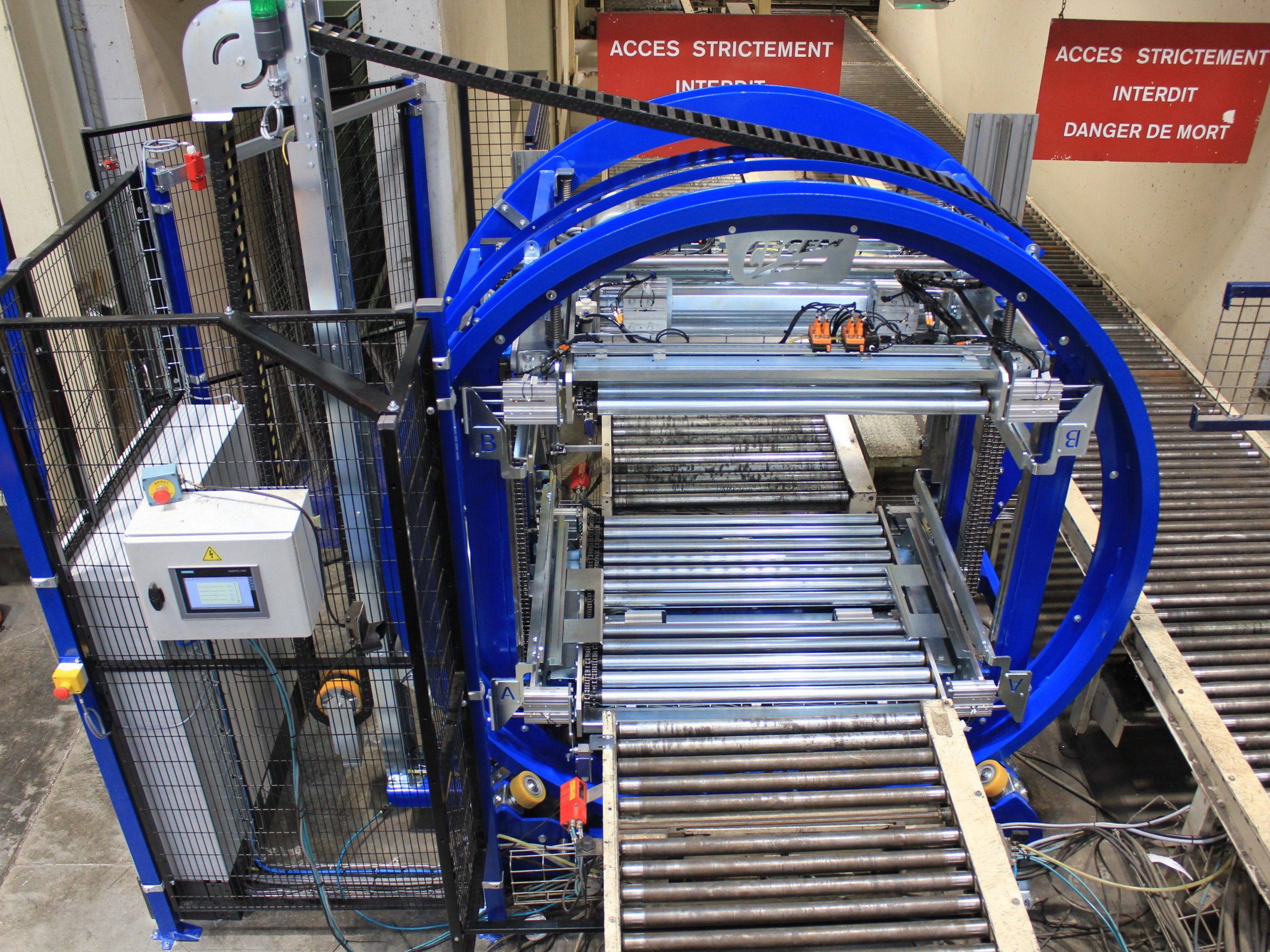 Intégration dans une ligne existante d’un système pour le centrage et le retournement de produits sur des plateaux métalliques.