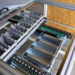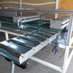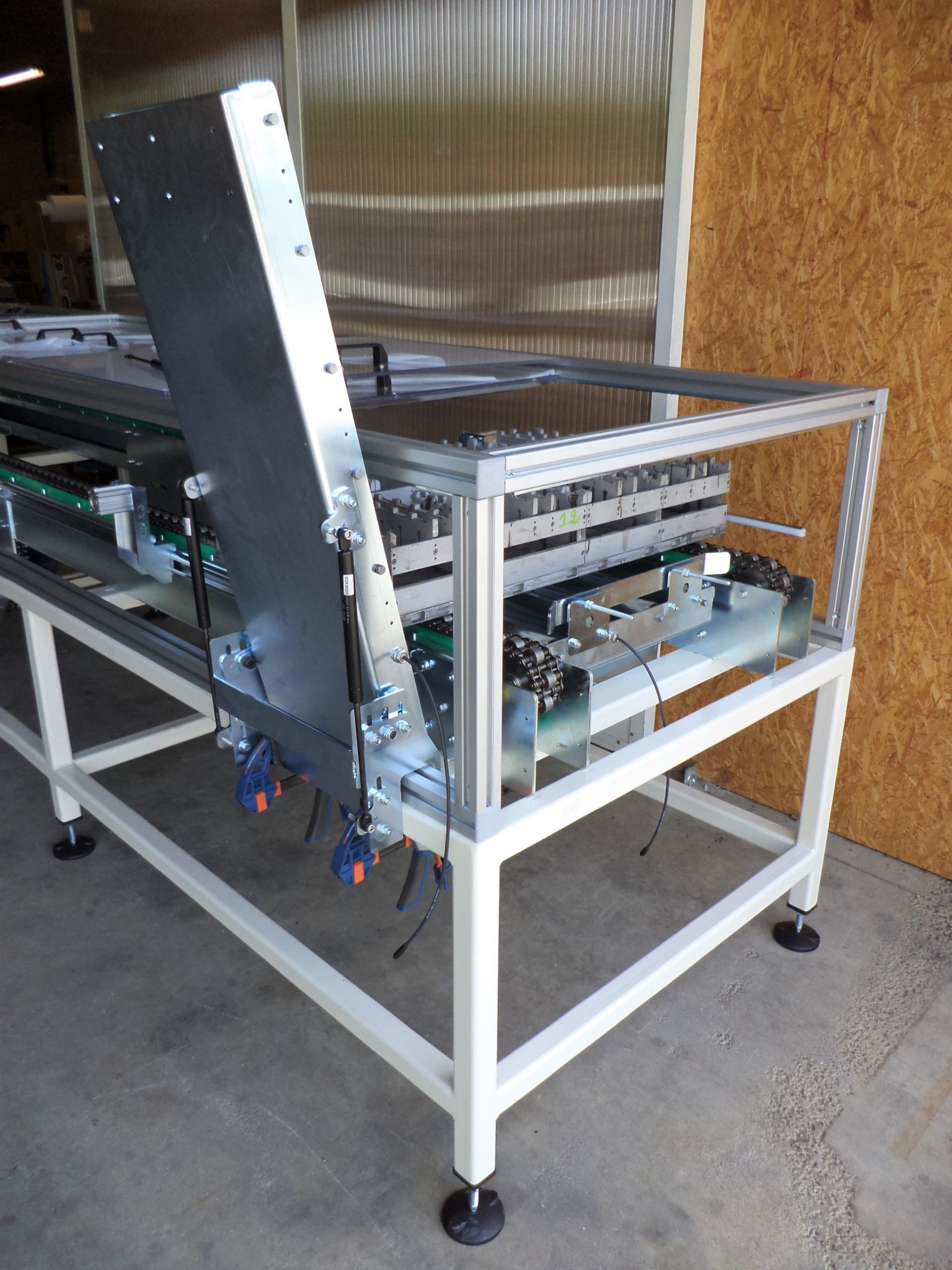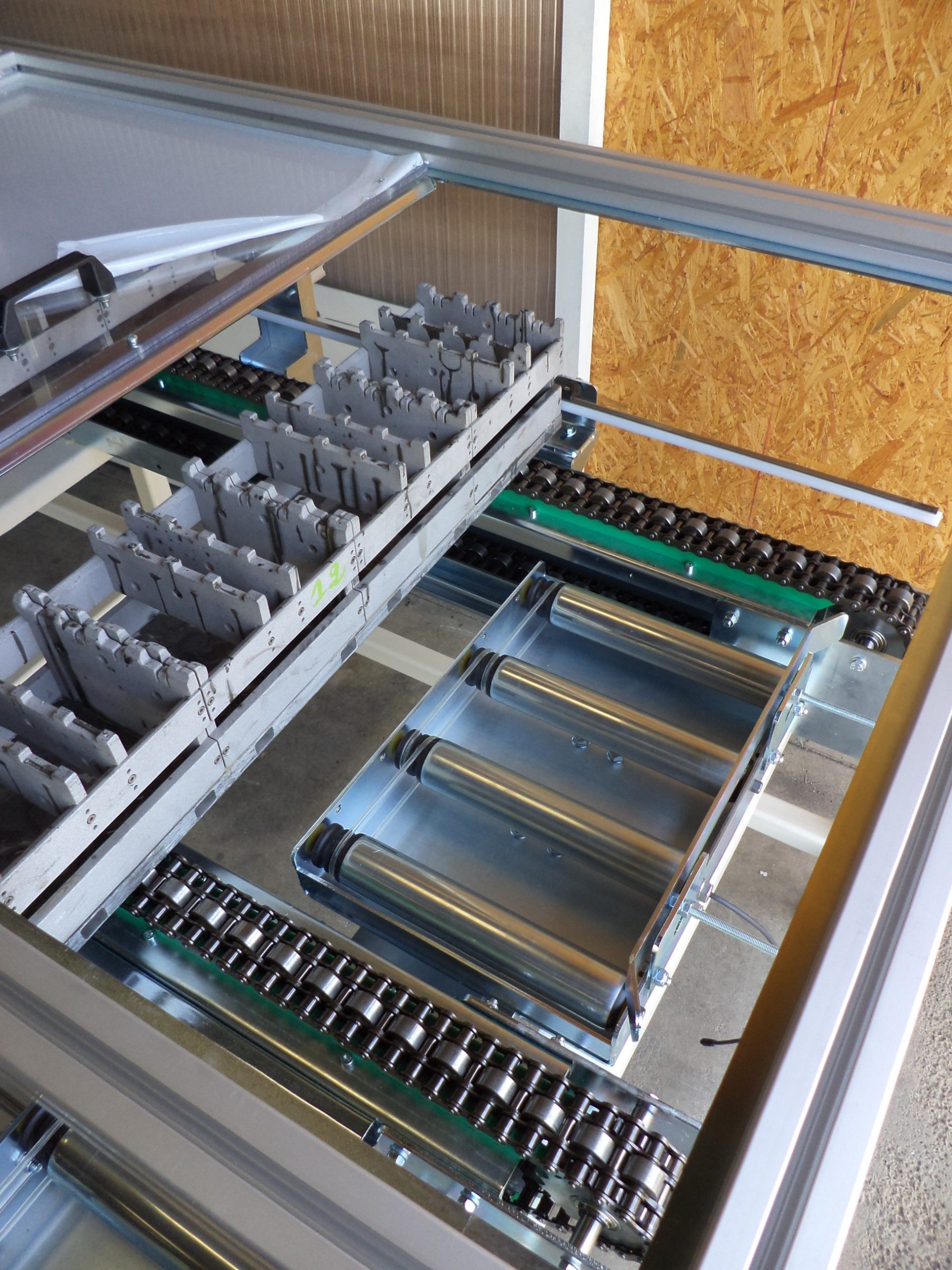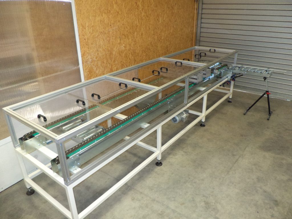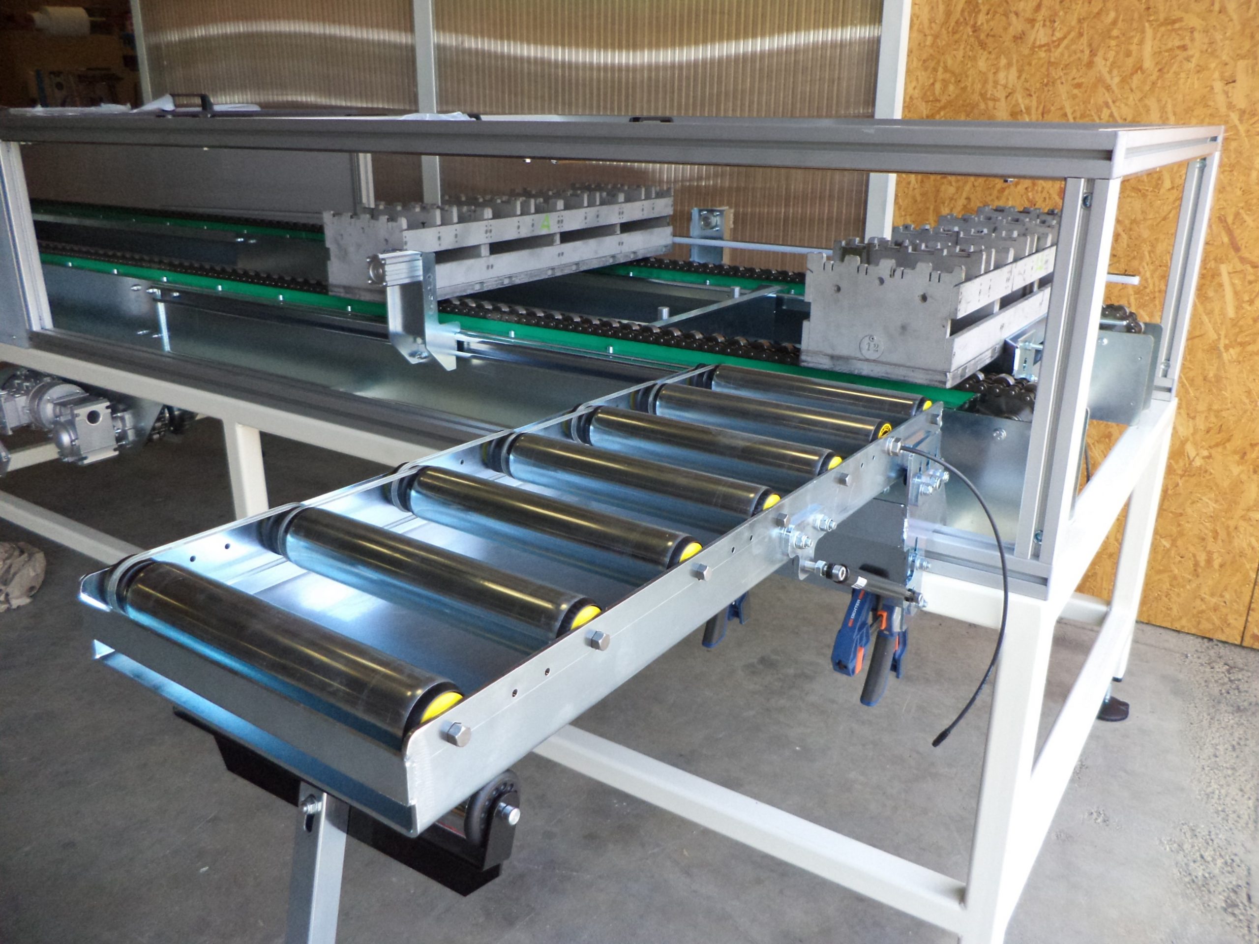Convoyeur à chaines à accumulation pour le transport et le transfert de navettes de 30kg.